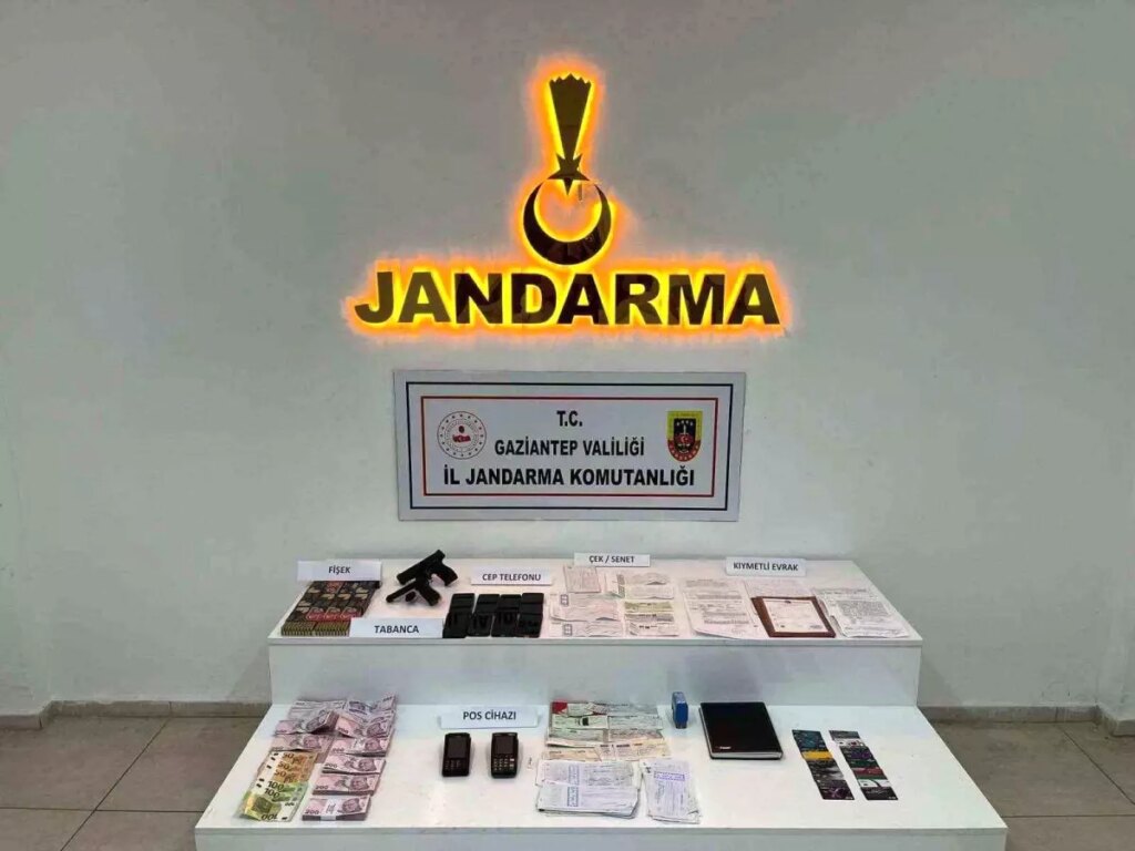 Gaziantep Vilayet Jandarma Komutanlığı takımları, çek/senet dolandırıcılığı, tefecilik ve yağma cürümlerine yönelik Cumhuriyet Başsavcılığı koordinesinde çalışma yaptı. Yürütülen fiziki ve teknik takip ile saha çalışmaları sonucu, Gaziantep vilayetinde konut, arsa vb. alışverişinde kurul karşılığı para vermek, vadeli satış ismi altında senet imzalatma üzere teknikleri kullanarak Tefecilik ve Yağma hatalarını M.D. liderliğinde örgütlü olarak işlediği tespit edilen örgüt üyeleri, C.M., M.D., D.D., R.Ç., E.R., M.S.K. ve E.Y. olmak üzere toplam 8 şüpheliye yönelik olarak 10 farklı adrese olmak üzere eş vakitli şafak operasyonu düzenlendi. Düzenlenen operasyonlarda, örgüt lideri M.D. ve üyeleri C.M., M.D., D.D., R.Ç., E.R., M.S.K. olmak üzere 7 kuşkulu yakalanarak gözaltına alındı.
